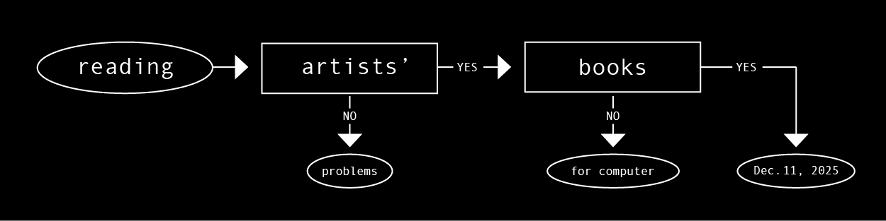 The Reading Artists’ Books series was initiated by Regine Ehleiter and Tabea Nixdorff (Arnhem) in memory of Chicago-based curator and librarian Doro Boehme (1957–2020). It offers a public platform for artistic publishing practices through collective reading and lecture formats. Previous editions focused on publications as a medium for presenting artistic writing practices (HGB Leipzig, 2022) and on “asemic writing,” inspired by the works of Argentine conceptual artist Mirtha Dermisache (Freie Universität Berlin, 2024). Recordings of previous events are available on the series’ Vimeo channel.